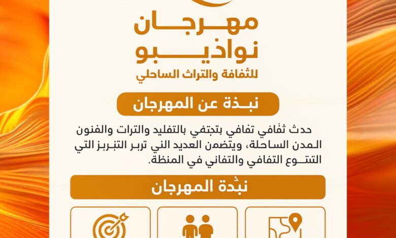 اليوم السابع الموريتاني تستعد العاصمة الاقتصادية نواذيبو لاحتضان النسخة الأولى ، من مهرجان نواذيبو للثقافة والتراث الساحلي يومي 26-27 نوفمبر الجاري ، بمشاركة كوكبة من نجوم الفن الموريتاني.