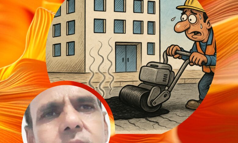 مؤسسة غير مرخصة تخطط شارعا وتمهده وتبنيه وتعبده لفترة تتجاوز ثلاثة اشهر فى منطقة ” المطار القديم” مع انها غير مرخصة لم تتبع أية إجراءات قانونية أو إدارية