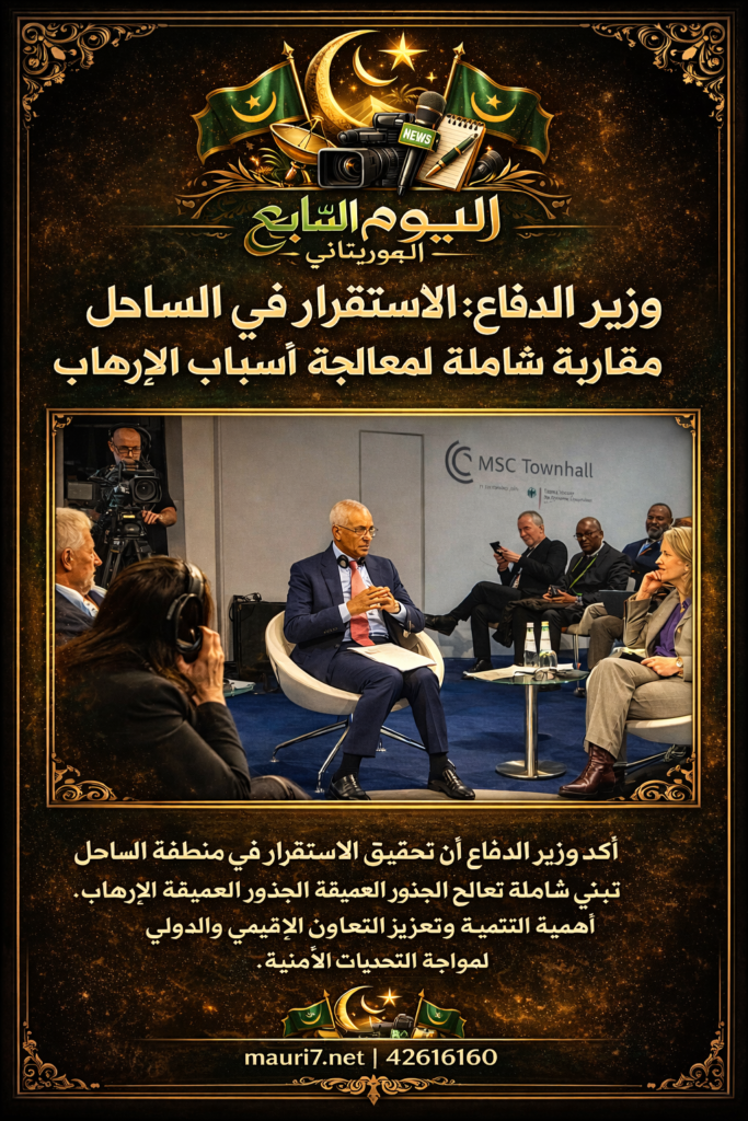 نواكشوط اليوم السابع الموريتاني أكد وزير الدفاع وشؤون المتقاعدين وأولاد الشهداء، حنن ولد سيدي، أن تحقيق استقرار دائم في منطقة الساحل يقتضي اعتماد مقاربة شاملة تعالج الأسباب الجذرية للإرهاب، موضحًا أن المعالجة الأمنية والعسكرية ـ رغم أهميتها ـ لا تكفي وحدها ما لم تُستكمل بجهود تنموية تستهدف تجفيف منابع التطرف والعنف.