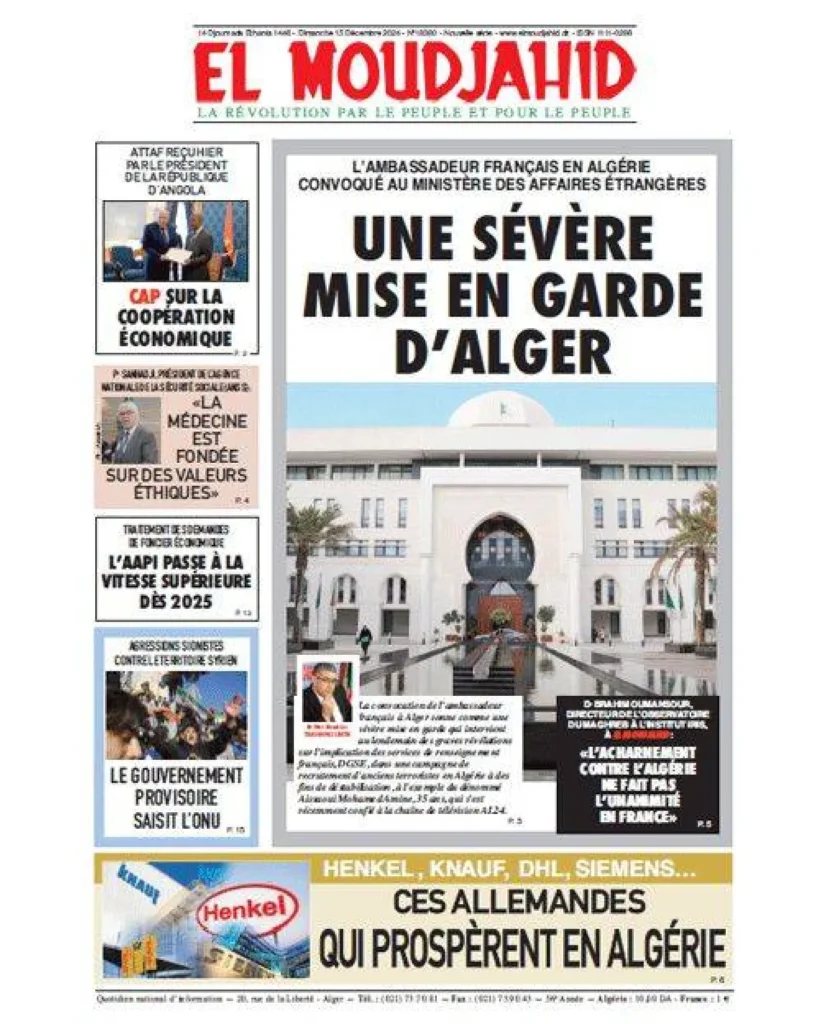 نشرت صحيفة «المجاهد» الفرنكفونية، أكبر الجرائد الحكومية في البلاد، بموقعها الإلكتروني، ليل السبت – الأحد، خبر استدعاء السفير الفرنسي لدى الجزائر ستيفان روماتيه، الأسبوع الماضي، «حيث تم توجيه تحذير شديد له، بعد الكشف عن معلومات خطيرة تتعلق بتورط جهاز الأمن الخارجي الفرنسي، في حملة لتجنيد إرهابيين سابقين في الجزائر، بهدف زعزعة استقرار البلاد».