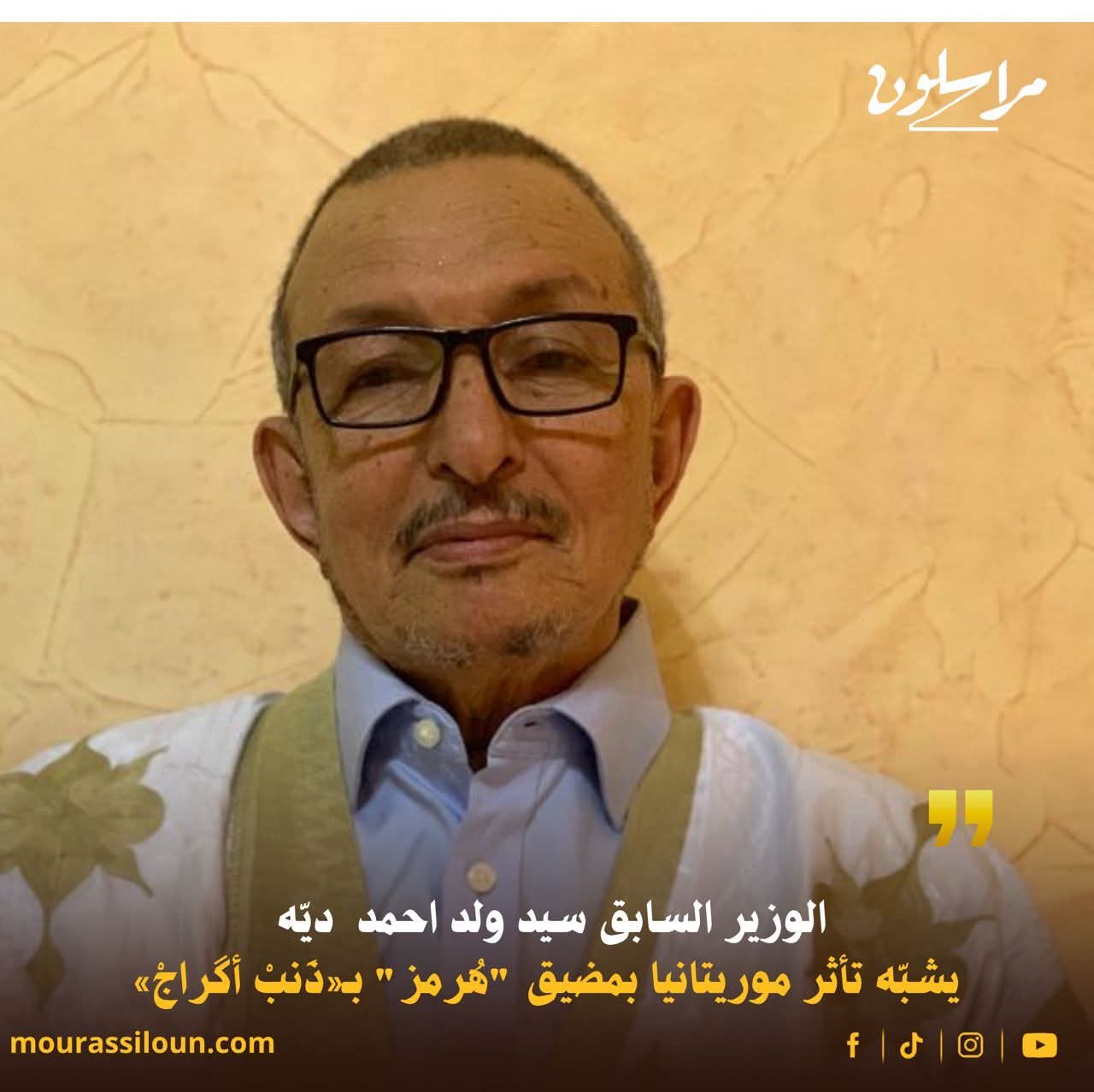 شبّه الوزير السابق سيد احمد ولد ديه تأثر موريتانيا بالأزمة العالمية للمحروقات الناتجة عن إغلاق مضيق هرمز في إيران، بمضمون المثل الشعبي (ذنب أگراج).